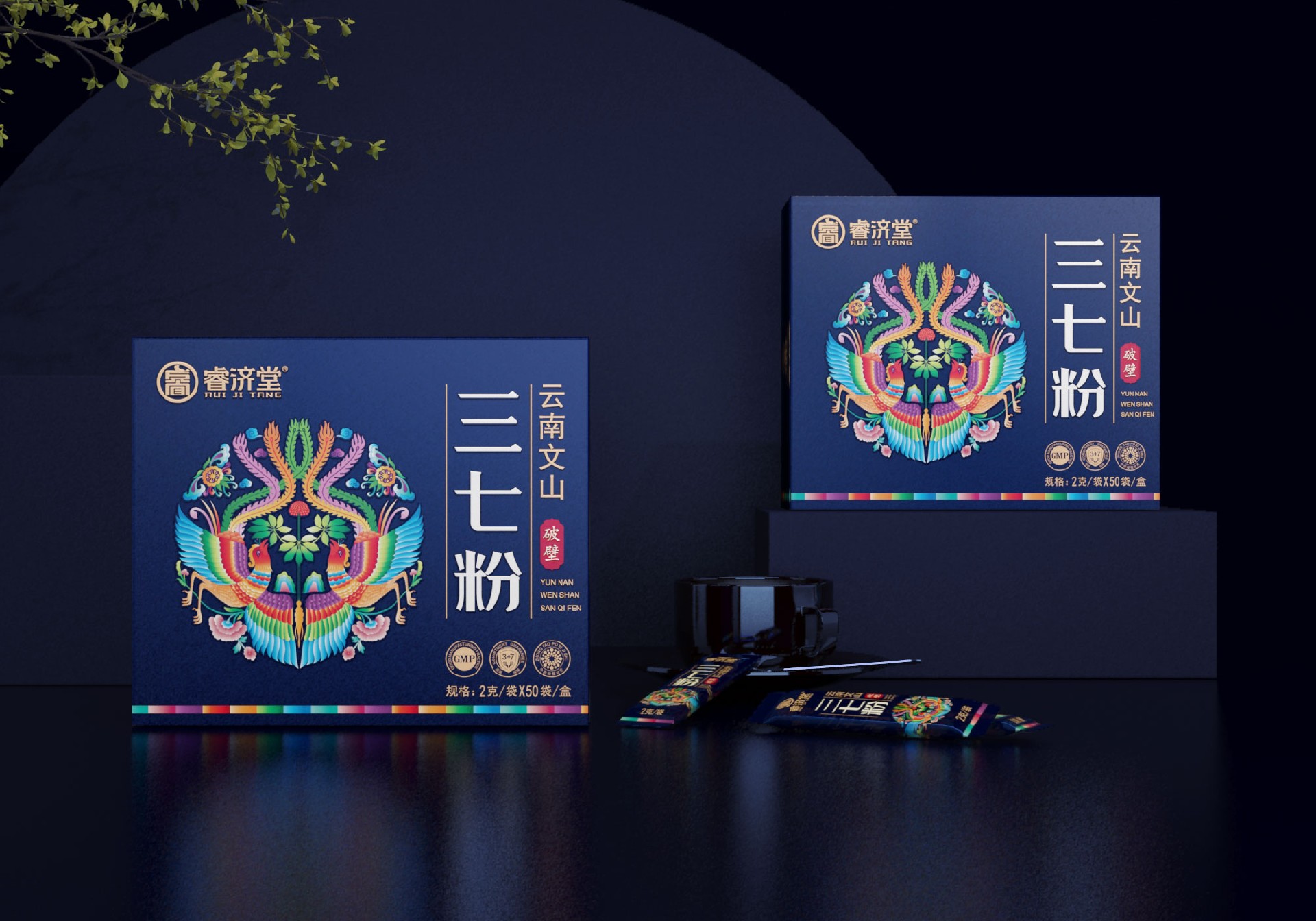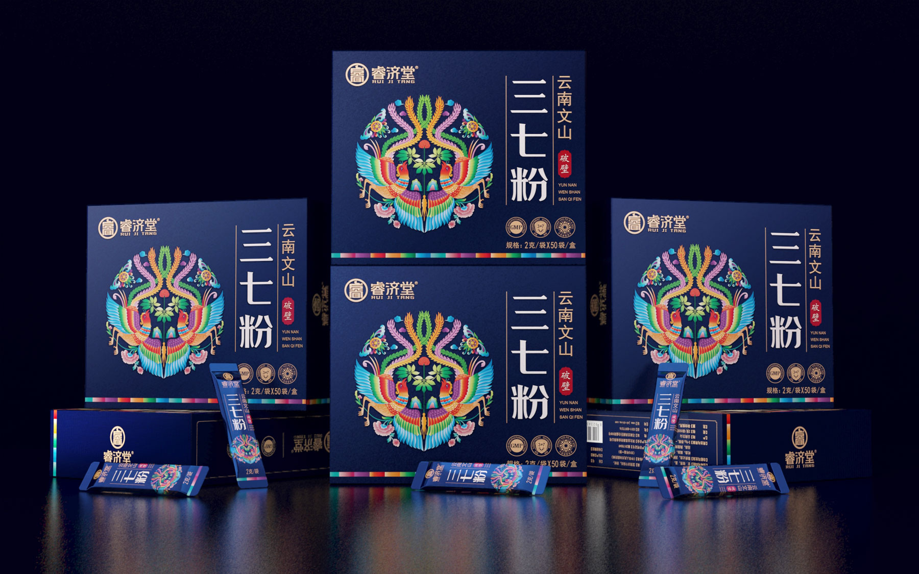 睿濟(jì)堂三七粉品牌產(chǎn)品專屬符號以云南少數(shù)民族文化為創(chuàng)意特征,其目的是讓顧客第一眼就感受到睿濟(jì)堂三七粉是云南正宗道地藥材凈制而成,久負(fù)盛名有著悠久歷史,藥效獨(dú)特為中草藥經(jīng)典驗(yàn)方。